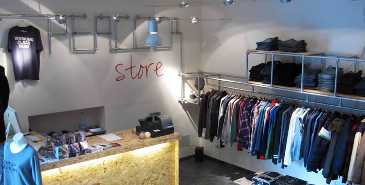 Scaffali e appendiabiti realizzati con tubi idraulici e giunti Interclamp conferiscono al negozio un’atmosfera mista di stile industriale e underground.